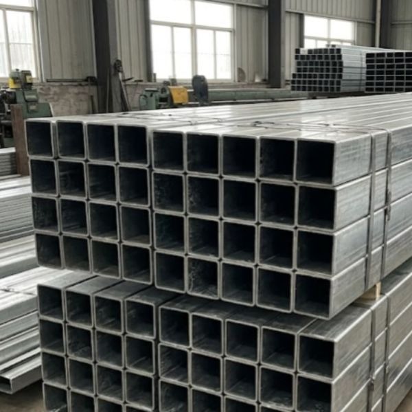 GI (Galvanized Iron) square tubes, an essential building and industrial material as referenced by sources like ISCON, HTL, Surya, and Apollo. The tubes are made of steel, treated with a thick layer of protective zinc coating. The primary visual characteristic is the distinct spangled pattern on their surface—the mottled, crystalline look of the solidified zinc. This coating is visibly rugged and utilitarian, with variations in the spangle size and occasional industrial markings, scratches, and minor corrosion spots from storage, accurately representing a standard industrial product used for corrosion resistance. The metal appears heavy and durable, and the ends of the tubes clearly show the thickness of the hollow section walls.